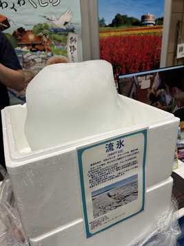 オホーツク海に現れる流氷。この氷は今年の2月に網走沖で採氷したものだそう。サハリンの北、アムール川河口付近の海上で作られるそうです。そして、約1,000kmの旅をして北海道に到着するんだって。 |