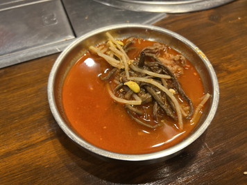 鶴橋に来たのは韓国料理を食べてみようって、計画したからなのです。クマ兄さんの会社の同僚が、大阪出身の人に紹介されて鶴橋で食べ歩きしたんだって。そしたらおいしかったらしいので、我が家も鶴橋で韓国料理を食べてみようってなったのです。何軒も韓国料理屋さんがあったのですが、なんとなく入りやすそうに思ったお店に入ってみました。おばちゃんに声をかけられたっていうのもある。 |