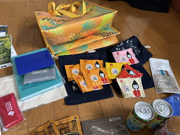 関空万博でもらってきたお土産たちを床に広げてパチリ。ご当地スナックやドリンクなどたくさんもらってきました。ドリンクが重いんだよねぇ。うれしい悲鳴です。 |