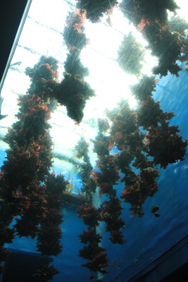 最初に頭上に現れたのは「マボヤのもり」。ロープにマボヤがたっぷり付着しています。こんな感じで養殖しているんだね。養殖は3〜4年かかるんだって。ホヤって東北地方ではよく食べますが、富山では食べたことないなぁ。 |