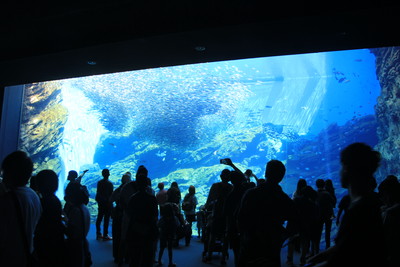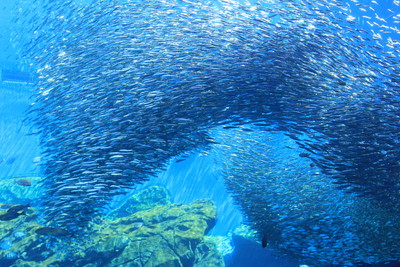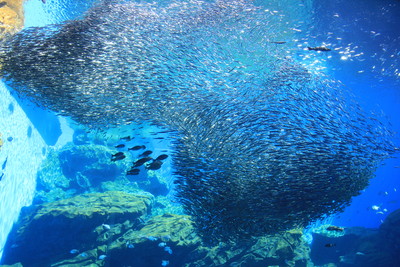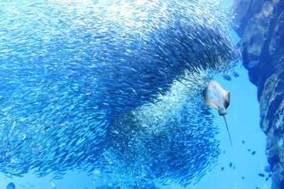 水槽の前で大きなイワシの群れの形が変わる様子を見ていると、時間を忘れてしまいそうです。 |