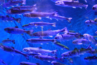 左はギンザケの水槽。ギンザケは日本の川には遡上しないんだって。成長が早く、脂が乗りやすいので二本でも養殖が盛んにおこなわれていて、日本でもよく食べられる鮭だそう。