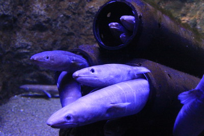 右はマアナゴ。食べるとおいしいよね。夜行性なので明るいと隠れるそうですが、筒状の隙間が入りやすいのでみんなで筒に入るらしい。 |
