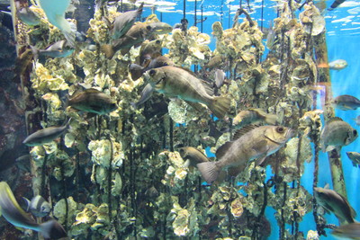 続いて「いのちきらめく うみ」。大きな水槽にたくさんの種類の魚が放たれています。一番目を引くのがイワシの群れ。 |
