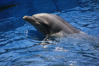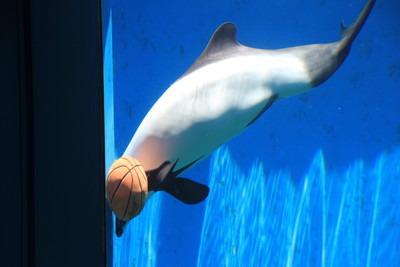 こっちの水槽ではイロワケイルカがボールで遊んでいました。パンダイルカとも言われるそうです。南米南端やインド洋南部にいるらしい。約8,000qも離れたところに生息しているというかなり珍しい生態だそう。 |