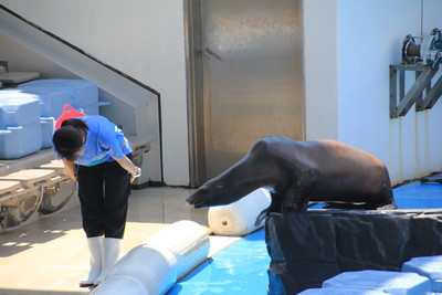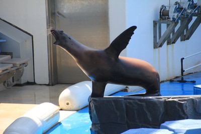 代わりにカリフォルニアアシカが飼育員さんといろいろなパフォーマンスを見せてくれます。そういえば、ネコ娘が留学しているサンディエゴって野生のカリフォルニアアシカが見られるんだよね。野生のアシカも見てみたいなぁ。 |
