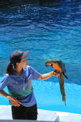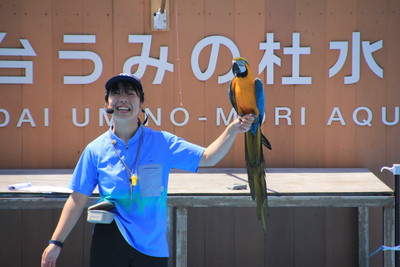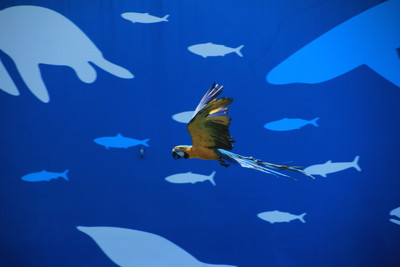 一番すごかったのがルリコンゴウインコのパフォーマンス。お客さんの頭上を飛び回り、最後に飼育員さんの手の上に戻ります。ルリコンゴウインコって知能が高く、社会性も兼ね備えているので、訓練をすると人の指示を聞くようになるんだって。幼児くらいの認知機能があるとか。かなり低空をハイスピードで飛び回るのでびっくりしたよ。 |