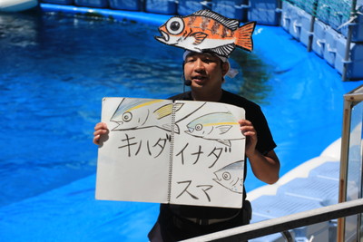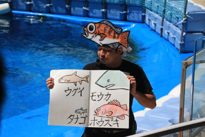 海獣とルリコンゴウインコのパフォーマンスが終わったら、おまけ的な感じでさかな芸人ハットリという人が出てきて、持ちネタを披露してくれました。いろいろな魚の絵をスケッチブックに書いてあって、その魚の名前で歌を歌う、という芸。結構面白かった。Youtubeにもたくさんアップされていました。 |