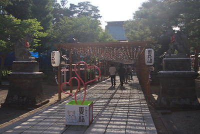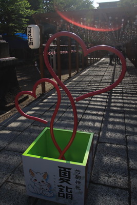駐車場に車を停め参道を歩く。参道には風鈴がたくさんつるしてありました。あと、ハートマークのモニュメントも。 |
