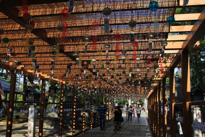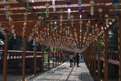 風鈴のトンネルをくぐる。風が吹くとチリリンって鳴って良い感じ。暑いけれどちょっとだけ涼しく感じる、かな。 |