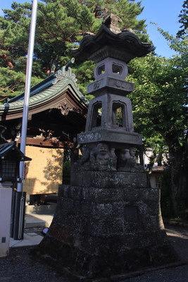 拝殿側から唐門を眺める(左)。この屋根の形(破風)がいいねえ。右は灯篭です。オヤジが灯篭を担いでいますね。 |
