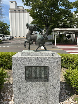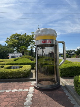 13:35、駐車場から受付へ。ビールジョッキのボックスがありました。電話ボックスだよね、これ。今では公衆電話は撤去されているようです。右は麒麟像。1907年に麒麟麦酒株式会社としてスタート。東洋には麒麟という霊獣がいるってことで採用されたそう。 |