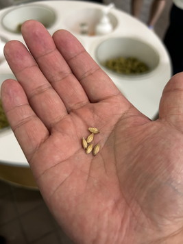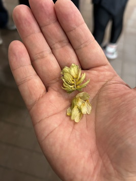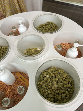 | 左は麦芽。スナックみたい。右はホップ。苦い。この苦みがビールのうまさのようです。 | |