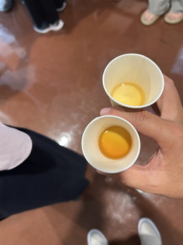 今度は麦汁の試飲。キリンビールの売りは一番搾り。普通のビールは一番麦汁と二番麦汁を混ぜて使うそうですが、一番麦汁りだけを使って作るビールがキリンのヒット商品。で、その一番麦汁と二番麦汁を試飲させてもらいました。濃いほうが一番麦汁。確かに味も濃い。これだけでビールを作ると一番搾りになるんだね。 |