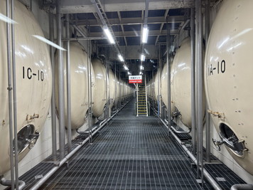 こちらは貯蔵タンク。ここで熟成をさせているらしい。熟成って雑味が減って、炭酸がなじむらしい。よくわかんないよね。 |