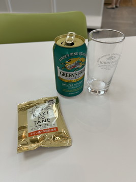 クマ兄さんはアルコールを飲んではいけないので、ノンアルコールビールのグリーンズフリーをいただきました。あと、おつまみにKAKI no TANEを一つもらいます。キリンビール酵母を使用しているらしい。