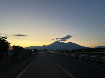 19:15、猪苗代湖の近くに差し掛かったところ。前方に磐梯山が見えてきました。シルエットに見えてキレイです。