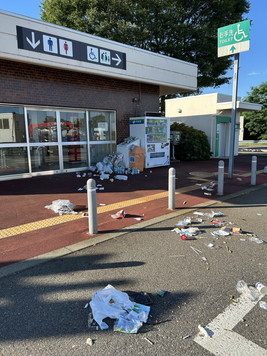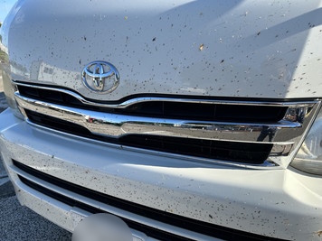 6:30、起床。大潟PAはトイレしかないので、車中泊仲間はいませんね。着替えをして、トイレに行くとゴミ箱が荒らされていました。カラスかなぁ?あとね、リラックスワゴンのフロントが虫だらけ。これはやばい。