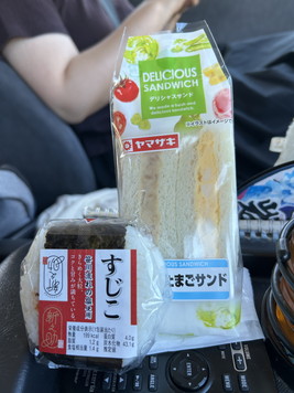 7:20、名立谷浜SAでいったんストップ。ここで朝食を購入します。すじこのおにぎり発見! |