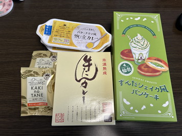 今回のお土産。カレーとずんだシェイク風パンケーキ、柿の種。最近はご当地カレーをお土産に買ってくるのが定番化しています。 |